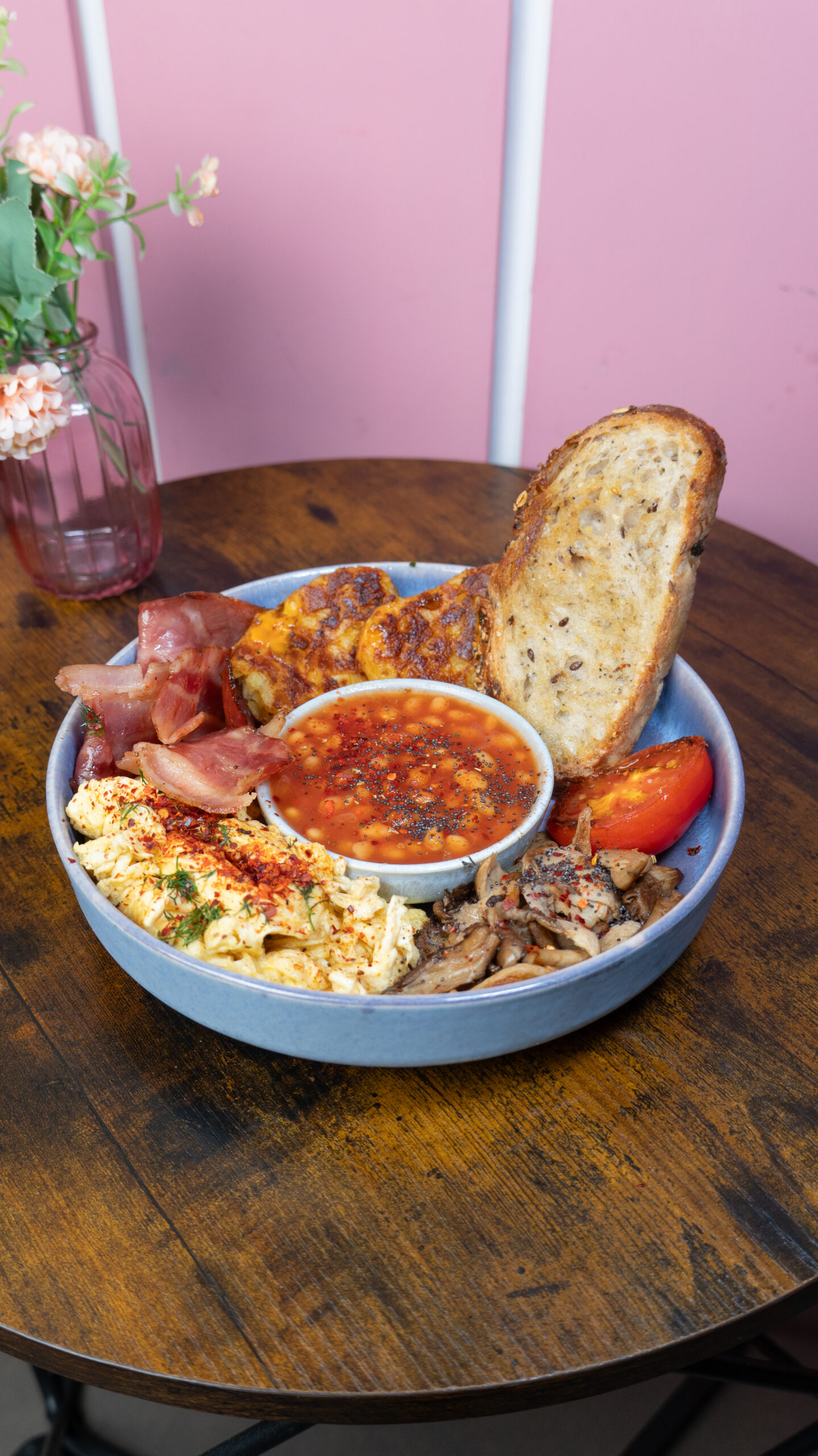 bacon, judías en salsa de tomate, dos hashbrowns y girgolas a la plancha.