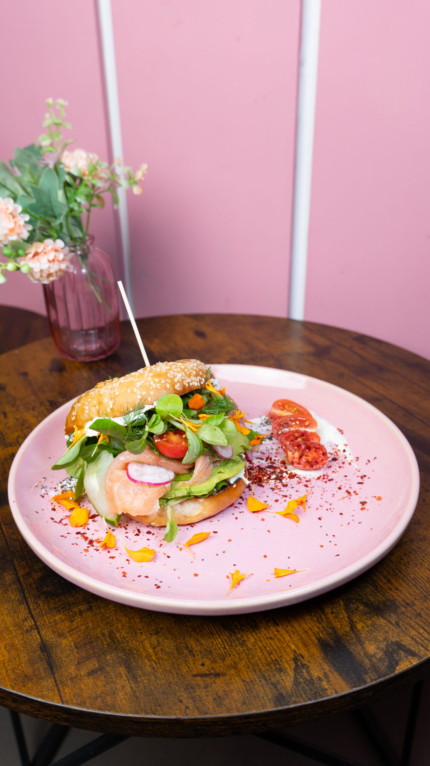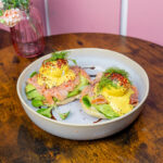 Suculento bagel de semillas con crema de‌ eneldo, pepino y aguacate, salmón ahumado,‌