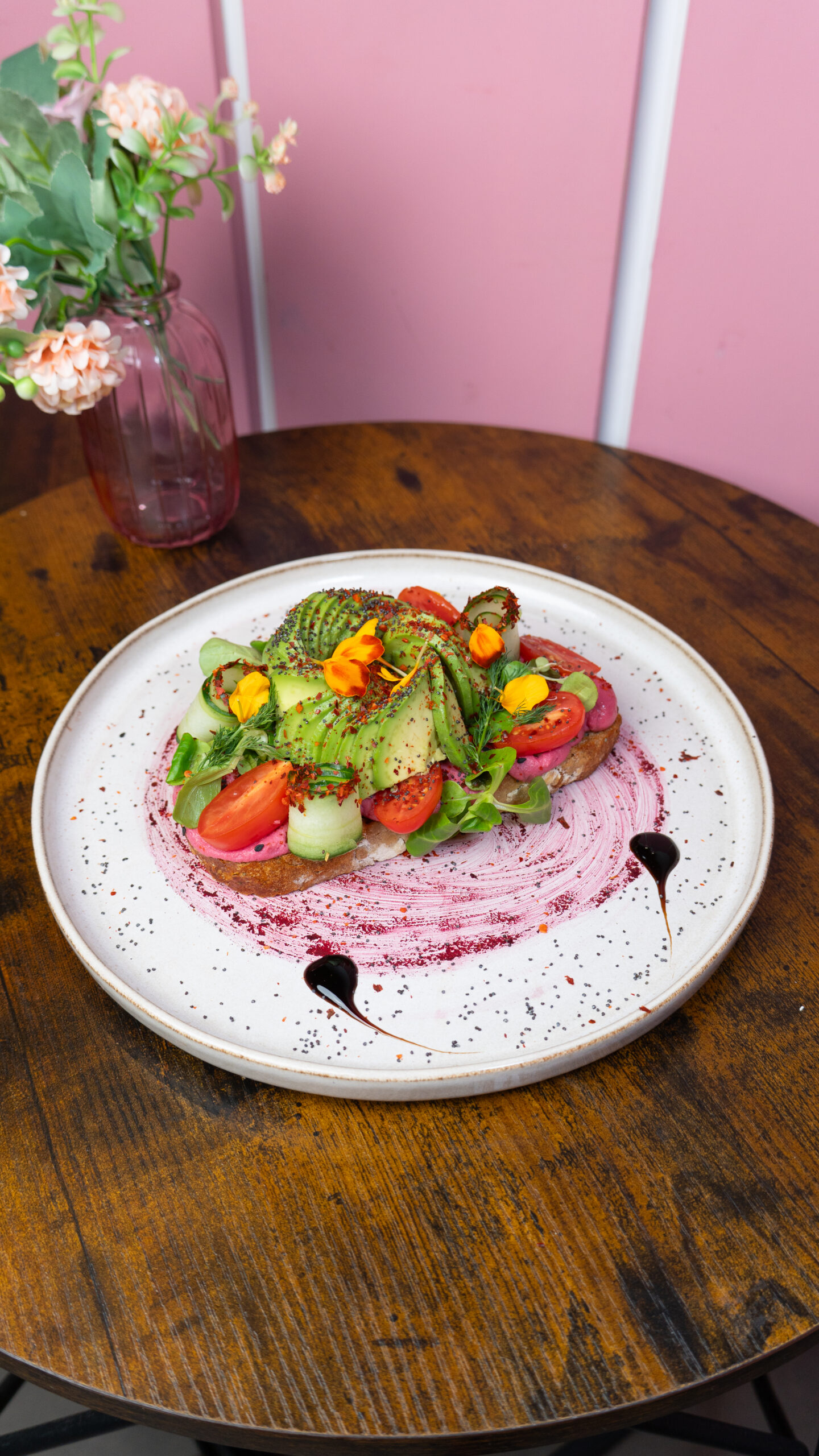 Tostada masa madre + hummus remolacha + aguacate + pepino + cherry
