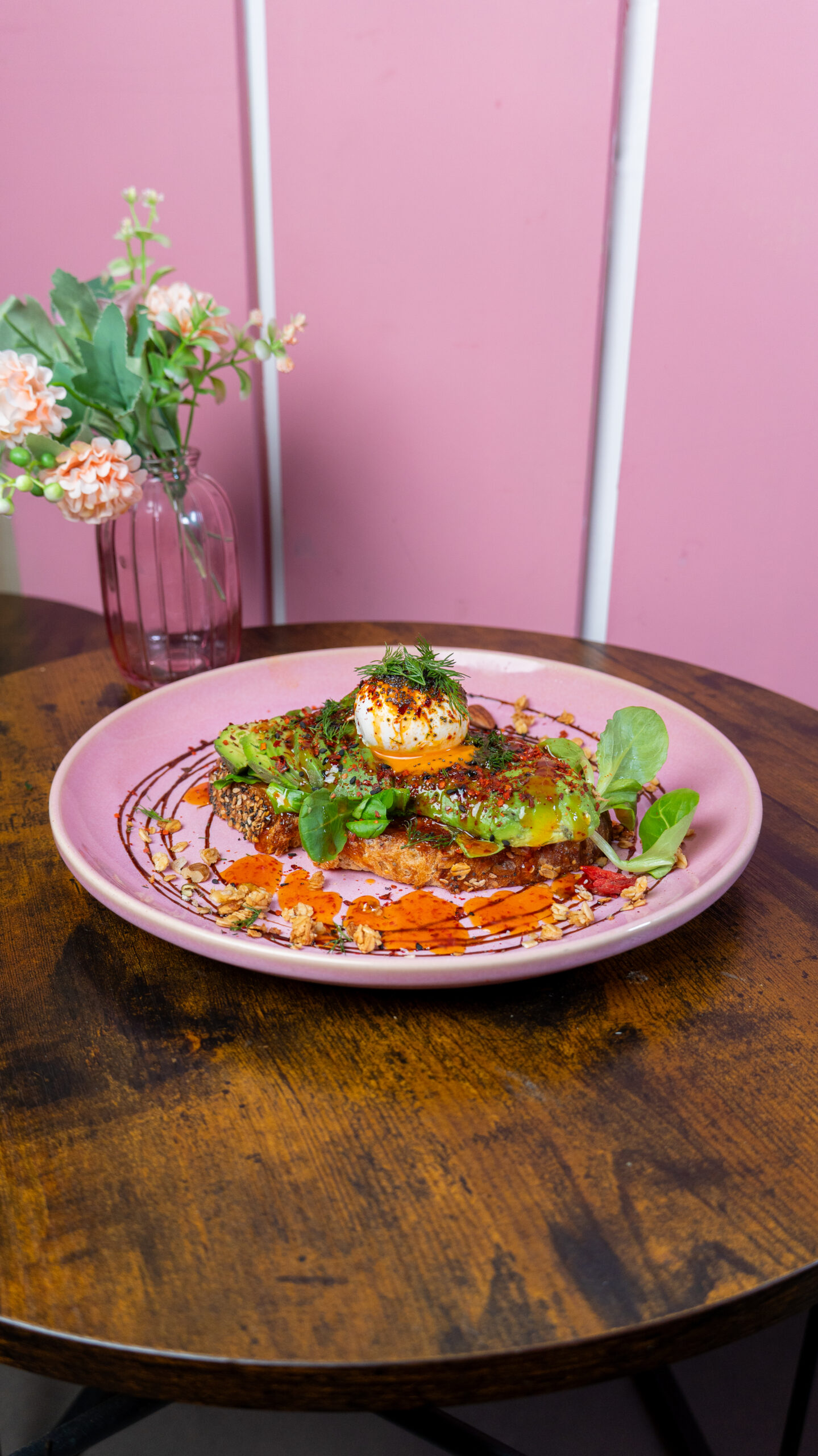 brotes, granola, huevo poché, flakes de chilli suave y salsa agridulce de la casa.