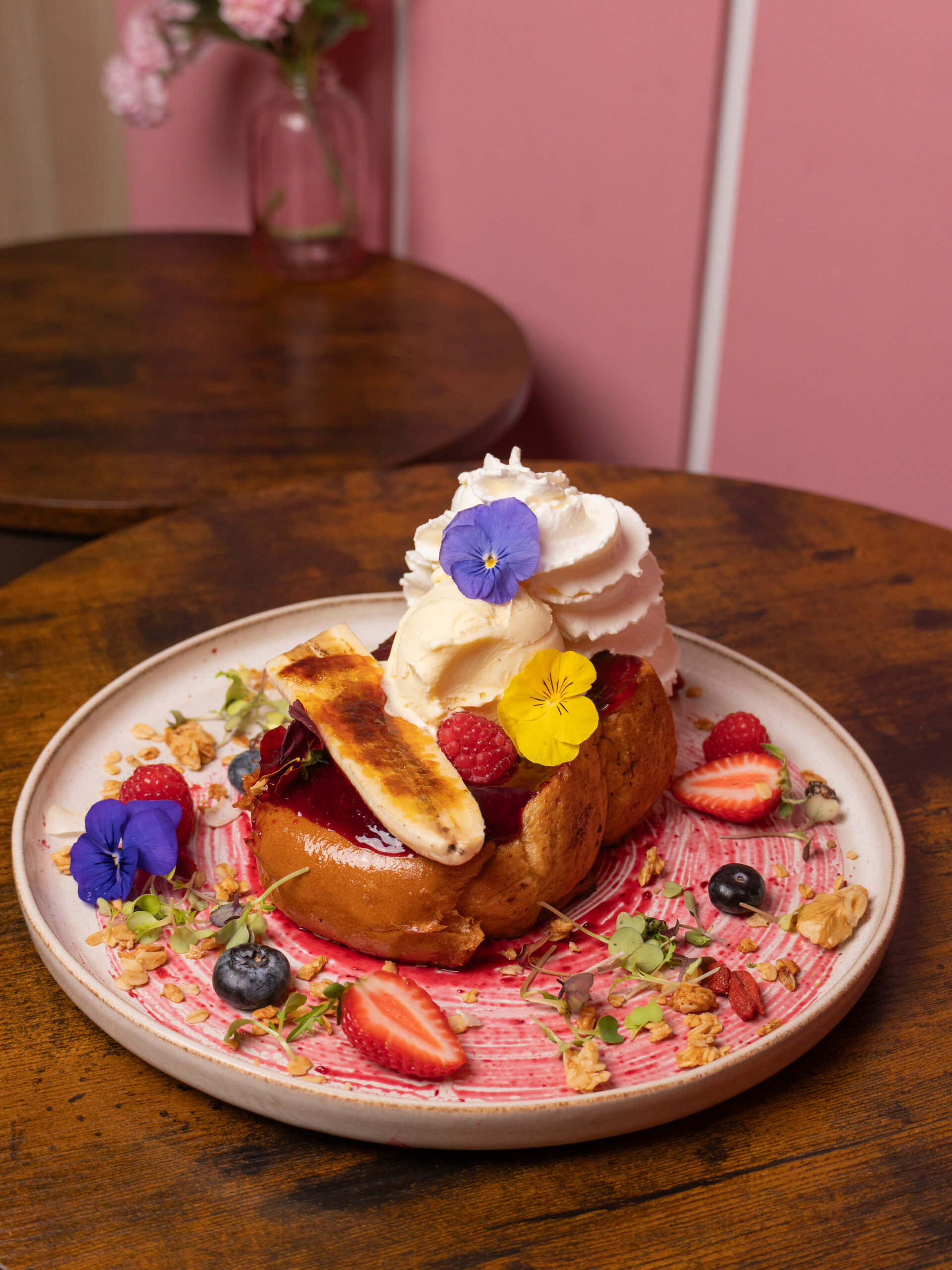 plátano, caramelizado, granola casera, azúcar glass, nata y helado de vainilla.