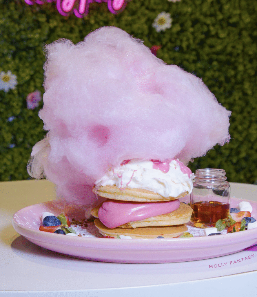 MOLLY FANTASY P A N C A K E S _____________________________________ Esponjosas Pancakes veganas cubiertas con una nube de nata montada, delicado chocolate rosa y algodón de azúcar. Acompañadas de fruta fresca cortada y suaves nubes (marshmallows) que le dan un toque mágico a cada bocado.