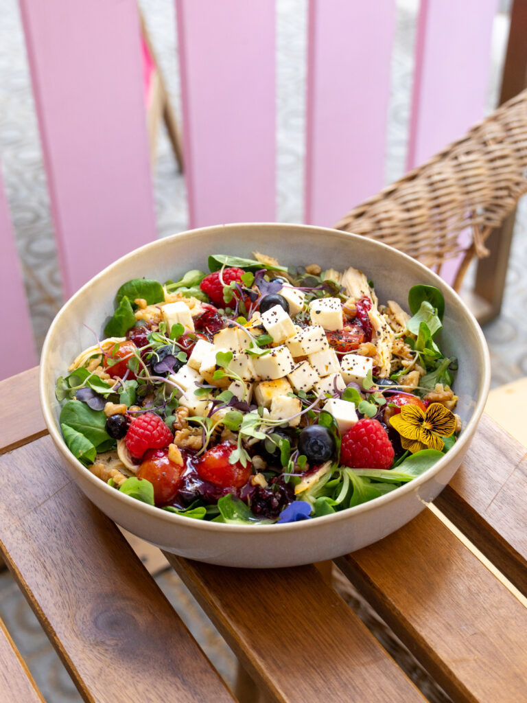 Flower Power Salad Ensaladas _____________________________________ Ensalada fresca a base de canónigos con pollo cocinado y desmenuzado, tomates cherry confitados, cebolla encurtida, dados de queso feta, arándanos y frambuesas frescas. Decorada con micromezclum y flores comestibles, aliñada con vinagreta de frutos rojos de perfil agridulce.