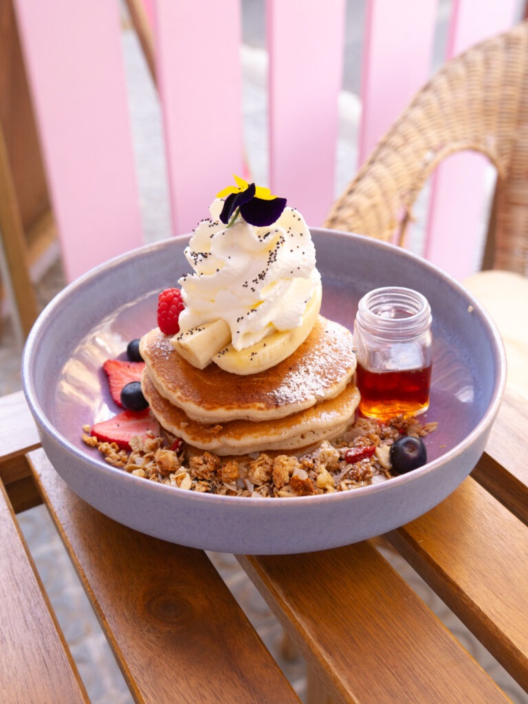 CLASSIC PANCAKES P A N C A K E S _____________________________________ Las clásicas pancakes americanas veganas, con sirope de maple, mantequilla, un toque de azúcar glass, fruta cortada, granola y nata.