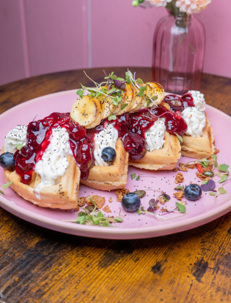 CLOUD NINE P A N C A K E S _____________________________________ Waffle con mermelada de frutos rojos, crema de queso y lima, Arándanos, granola, mininubes, azúcar glass y sirope de arce.