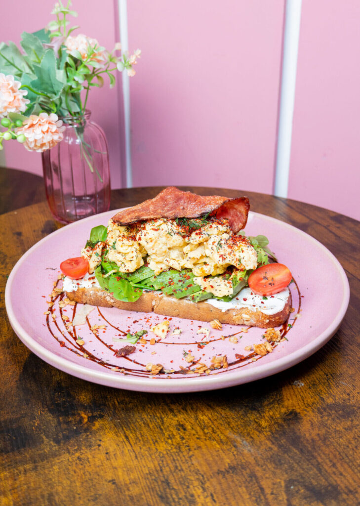 Scrambled Toastie Toasties _____________________________________ Tostada de pan semiintegral de masa madre con queso crema, aguacate laminado huevos revueltos con cebollino, tomates cherry, granola crujiente, crema balsámica, flakes de chilli suave y una lámina de bacon.