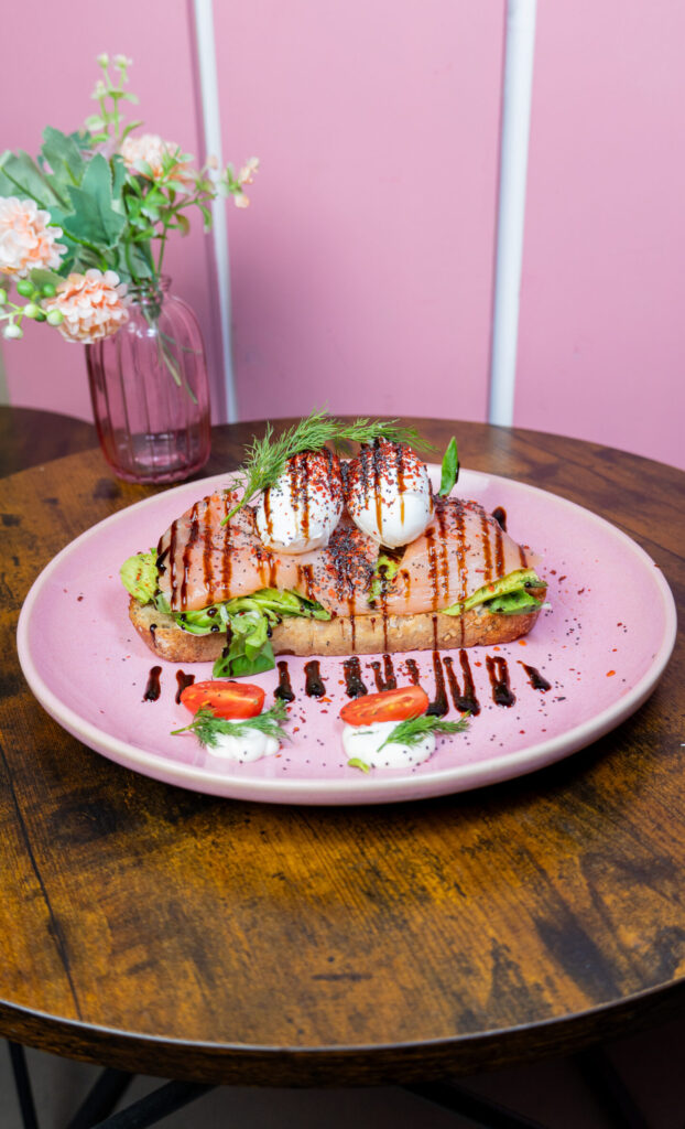 Smoked Toastie Toasties _____________________________________ Tostada de pan semiintegral de masa madre con láminas de aguacate, salmón ahumado huevo poché, brotes frescos, cebolla encurtida,flakes de chilli suave, semillas de sésamo crema balsamica de módena y mayonesa trufada casera.