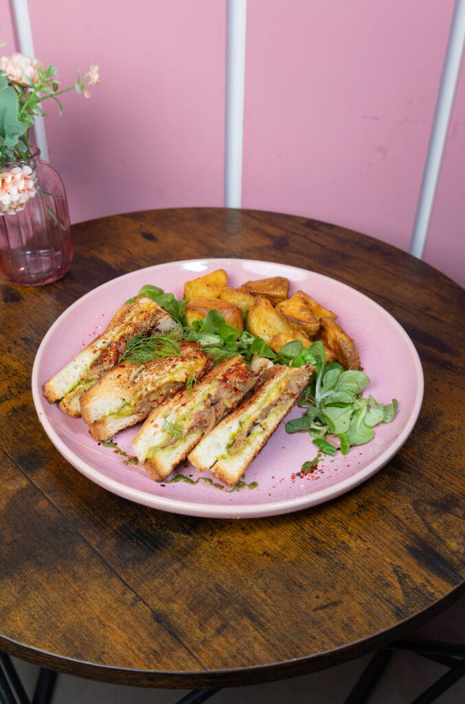 Catalán Toastie Toasties _____________________________________ Tostada de pan semiintegral de masa madre bajo una generosa capa de sobrasada, aguacate, micro brotes, granola, huevo poché, flakes de chilli suave y salsa agridulce de la casa. ¡Añade salmón por +3,50€!