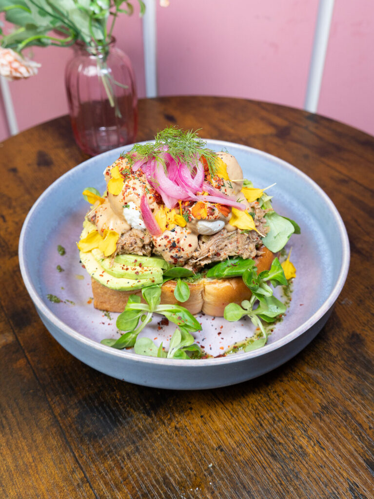 La Mechada Toasties _____________________________________ Tostada de pan semiintegral con láminas de aguacate, mayocilantro, cebolla morada encurtida, deliciosa carne de ternera deshilachada, brotes frrescos, flakes de chilli suave y huevo poché.