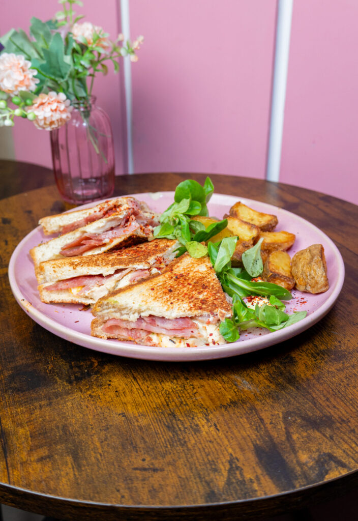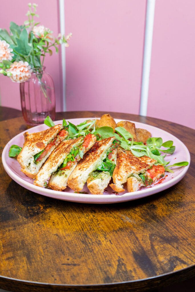 Mozzarella Pesto Sandwiches _____________________________________ Sándwich capresse que combina a la perfección el sabor de nuestro pesto casero con mozzarella fundida, rúcula y rodajas de tomate natural. Acompañado de patatas al estilo Molly. ¡Añade bacon o pollo +2,50€!