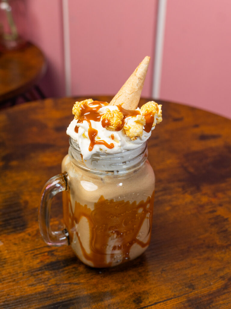 CRAZY MONKEY FRAPPES _____________________________________ Plátano, dulce de leche, helado vainilla, crema cacahuete, palomitas caramelizadas y mini cono