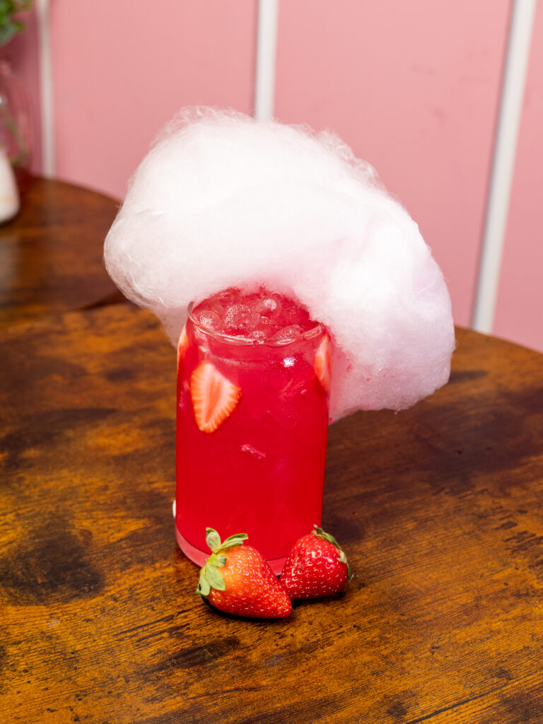 KISS LOVE Limonada rosa con sirope de rosas, lima y algodón de azúcar