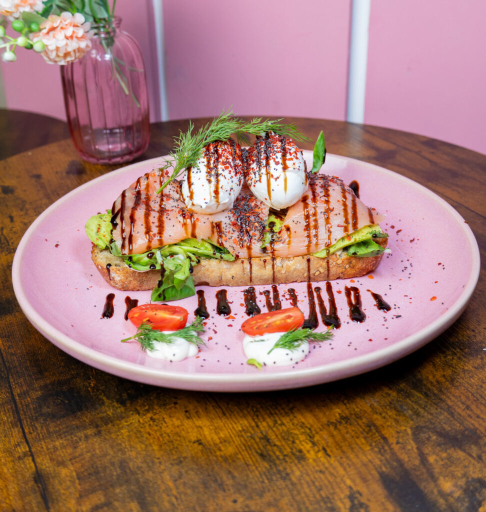 Avo Smashed Toasties _____________________________________ Tostada masa madre + smash aguacate + feta + brotes + granada + cherry + pesto + 2 huevos poché. (extras: bacon/pollo +2,50€; salmón +3,50€)